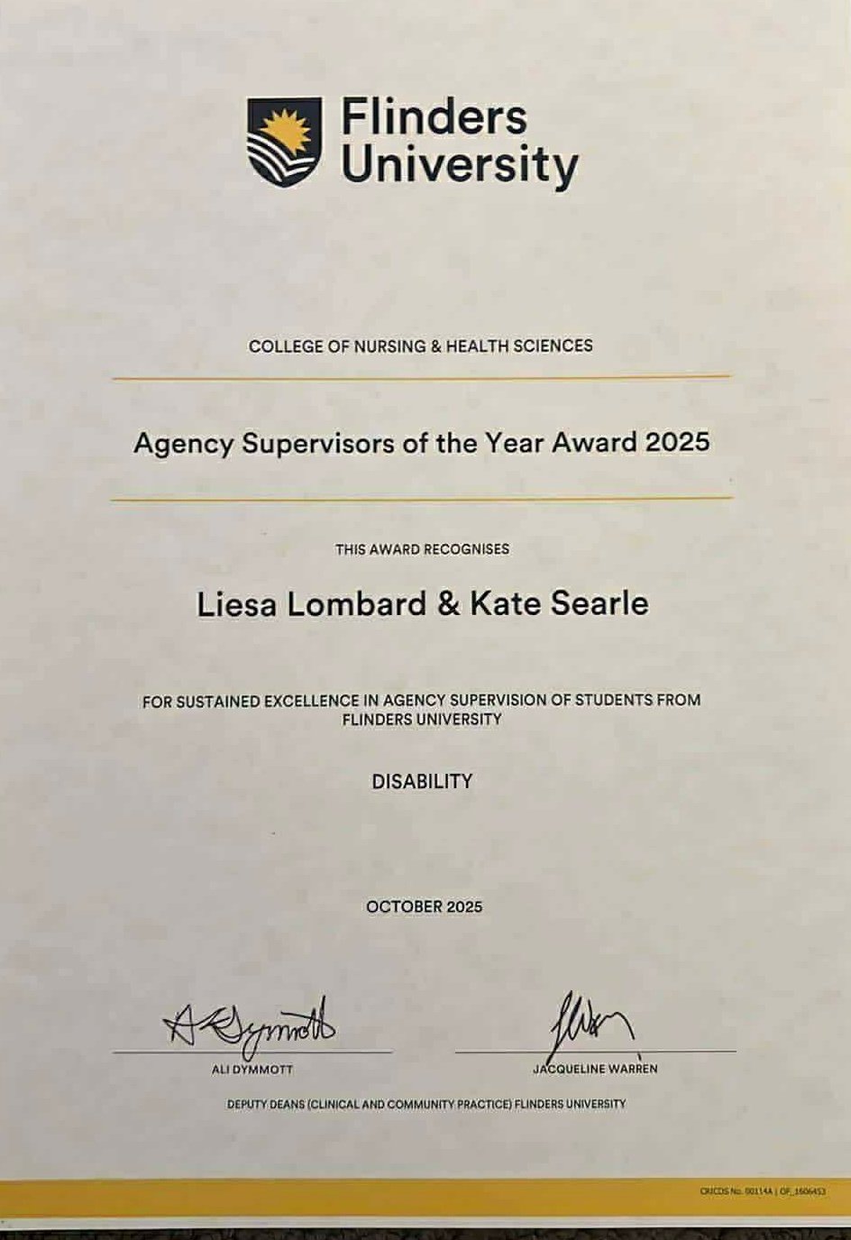 Recognised by Flinders University, Liesa Lombard and Kate Searle were awarded Agency Supervisors of the Year Award for 2025 for sustained excellence in Agency Supervision of students from Flinders University.